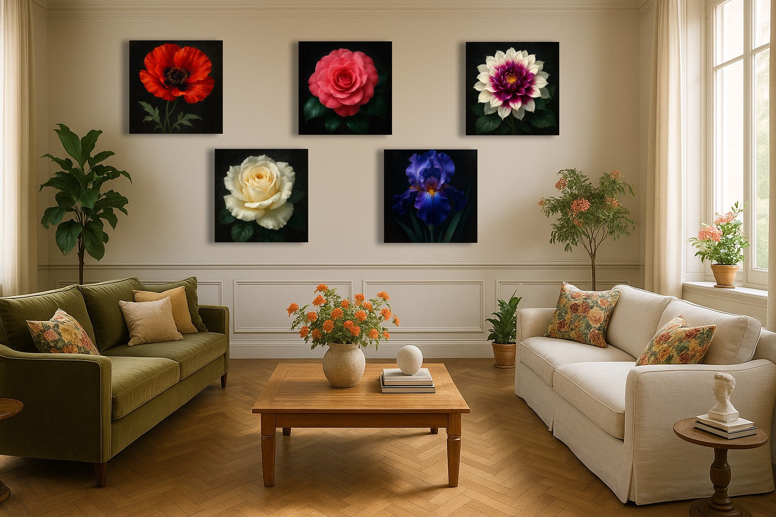 Un camélia rouge profond s’épanouit avec une précision presque picturale, chaque pétale dévoilant une texture veloutée sous une lumière douce. Son cœur vibrant capte le regard, tandis que le fond sombre fait ressortir l’intensité de ses teintes carmin et la brillance de son feuillage vert foncé. Cette œuvre incarne l’élégance naturelle et la beauté intemporelle des fleurs, idéale pour un salon raffiné, une chambre apaisante ou un espace de méditation.