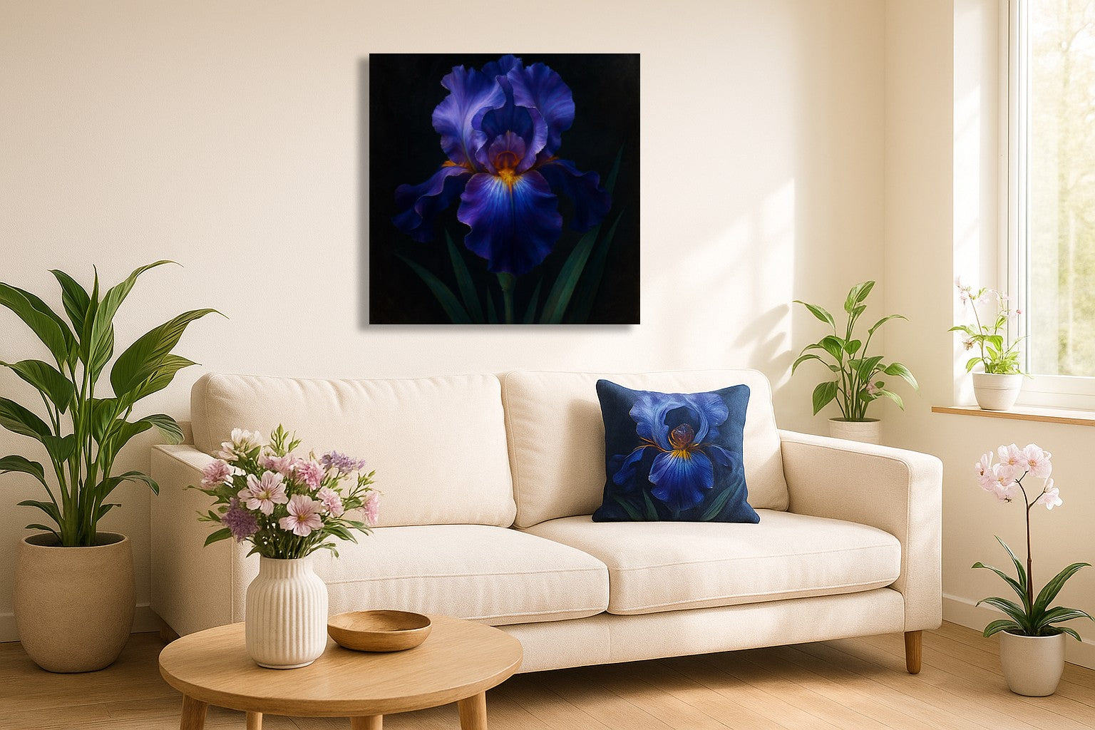 Un iris d’un bleu profond se déploie majestueusement sur un fond ténébreux, dévoilant des nuances subtiles de violet et d’indigo. Ses pétales soyeux, frangés de lumière, se parent d’un éclat doré en leur cœur, créant un contraste d’une intensité rare. Cette toile capte la force tranquille et la noblesse de la nature, à la fois mystérieuse et élégante. Parfaite pour sublimer un intérieur contemporain, un salon sophistiqué ou une chambre apaisante.