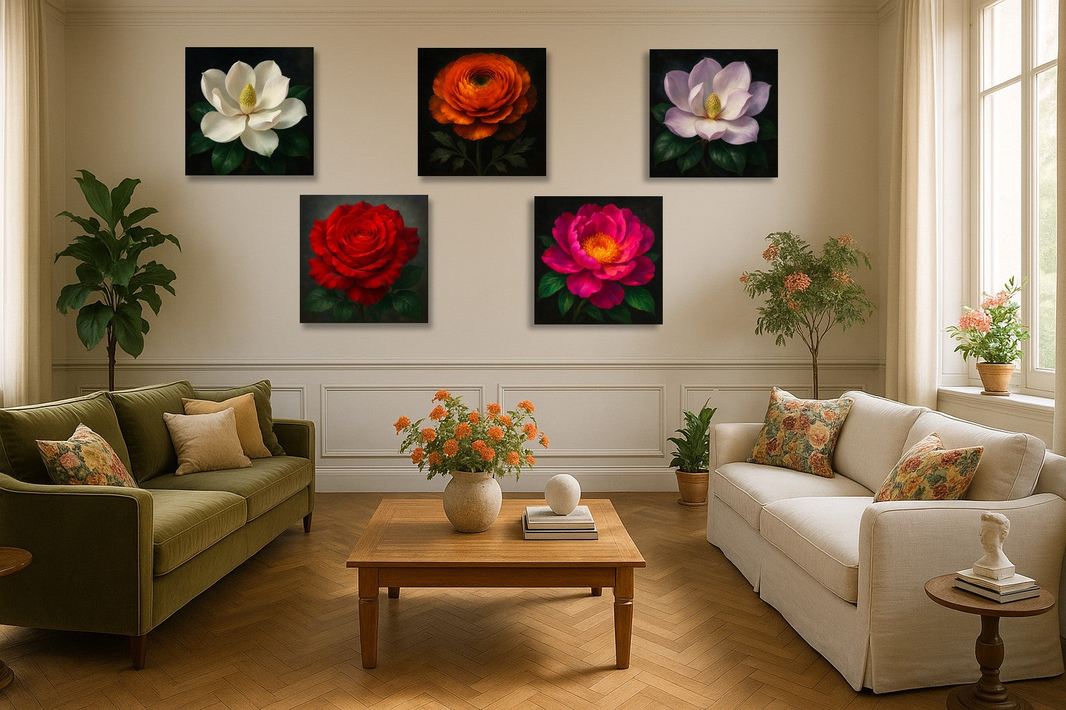 Une renoncule éclatante déploie ses pétales dans un dégradé somptueux d’orange et d’ambre profond. La lumière semble jaillir de son cœur, offrant une sensation de chaleur et de vitalité. Sur un fond sombre, chaque courbe se détache avec précision, créant une intensité à la fois sensuelle et raffinée. Cette toile attire le regard comme une flamme apaisée, parfaite pour réchauffer un salon contemporain ou une pièce au style artistique affirmé.