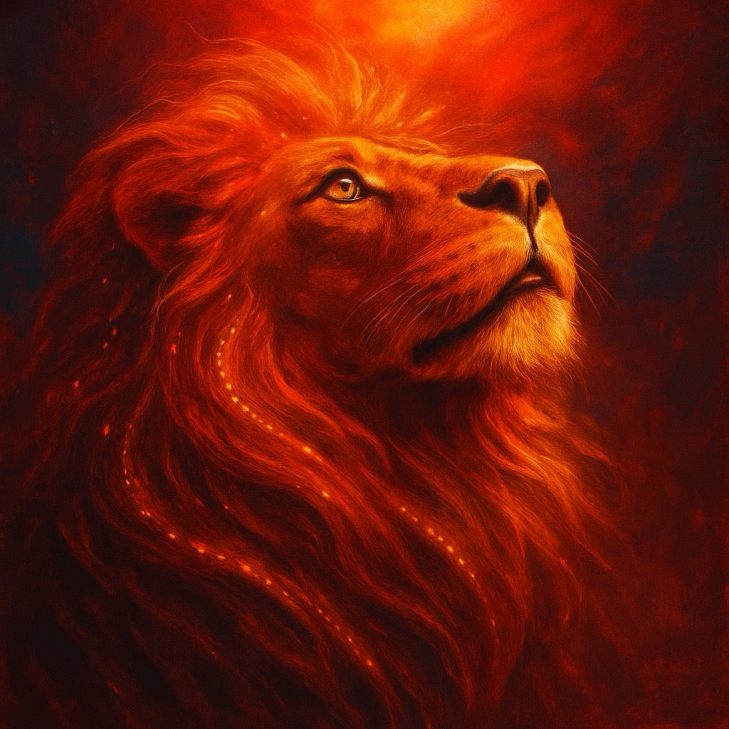 Ce lion embrasé de lumière semble émerger d’un halo incandescent, sa crinière parcourue de filaments lumineux qui évoquent énergie, grandeur et spiritualité. Le regard tourné vers le haut apporte une dimension quasi céleste, renforçant la puissance symbolique de la scène. Une œuvre intense, idéale pour magnifier un salon audacieux, un bureau créatif ou un espace où l’on cherche force et inspiration.