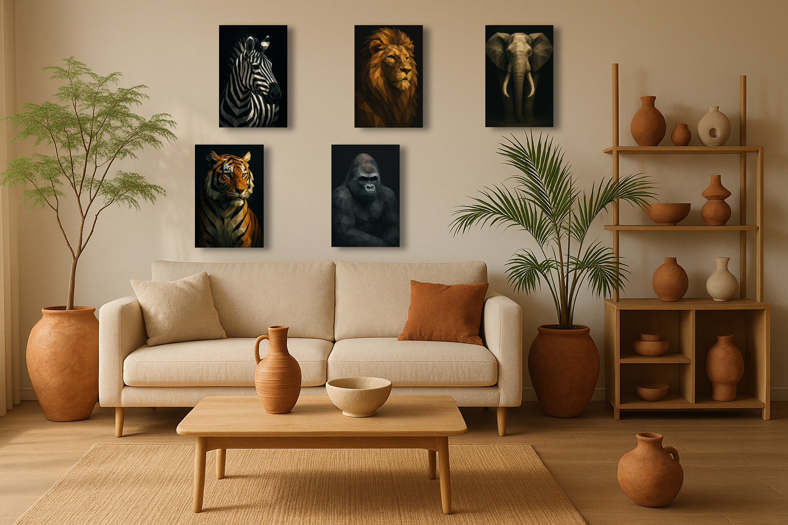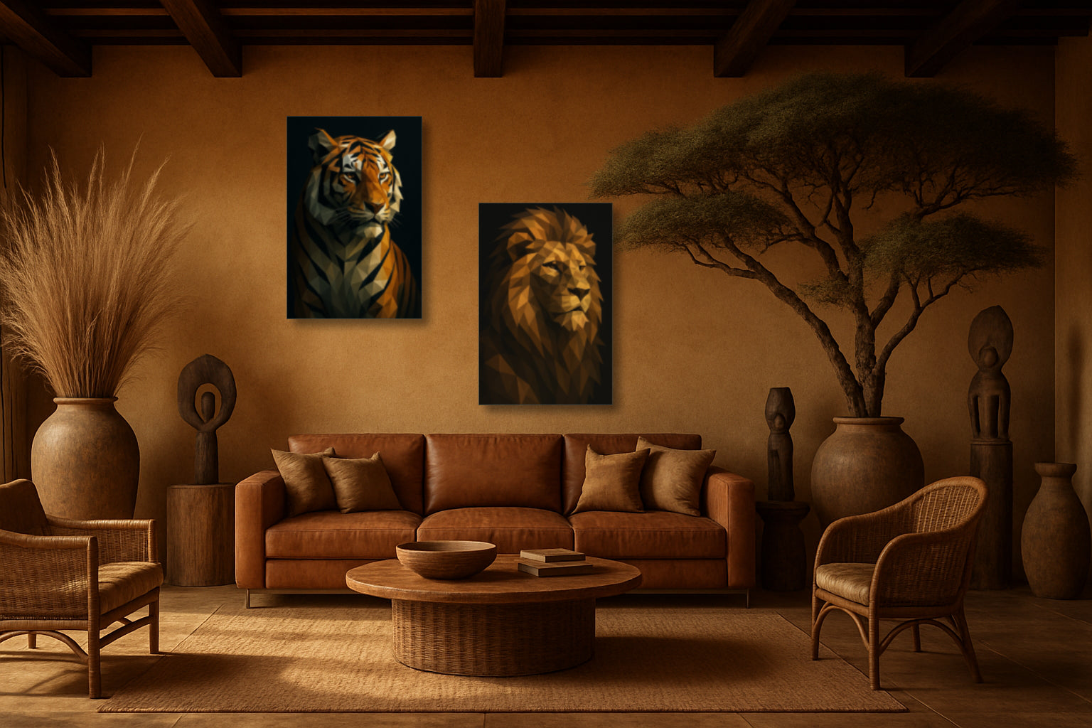 Ce tigre majestueux, sculpté en facettes anguleuses aux tons chauds d’ocre, d’orange et de beige, se dresse avec une présence calme mais puissante. Les ombres profondes et les contrastes nets accentuent la noblesse de son port, tandis que la structure géométrique lui confère une aura résolument contemporaine. Une œuvre forte, idéale pour un salon élégant, un bureau affirmé ou une entrée au caractère marqué.